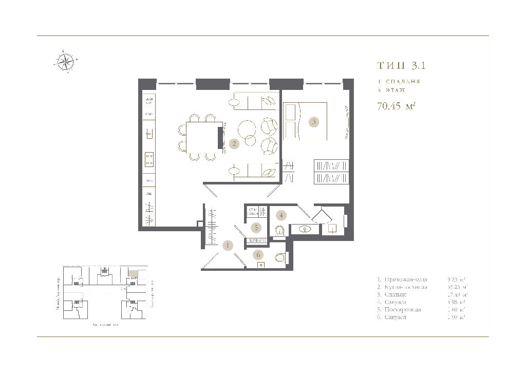 Лот с 1 спальней, с премиальной финишной отделкой, находится на 4 этаже Клубного дома TURGENEV. Панорамные окна спальни (17,48 м2) и кухни-гостиной (35,26 м2) выходят на западную сторону, из которых видна зона из зеленых насаждений. В спальне и прихожей-холле предусмотрены места хранения. Помимо основного санузла с душем (4,98 м2), в квартире есть гостевой санузел и постирочная комната. Дом сдан.